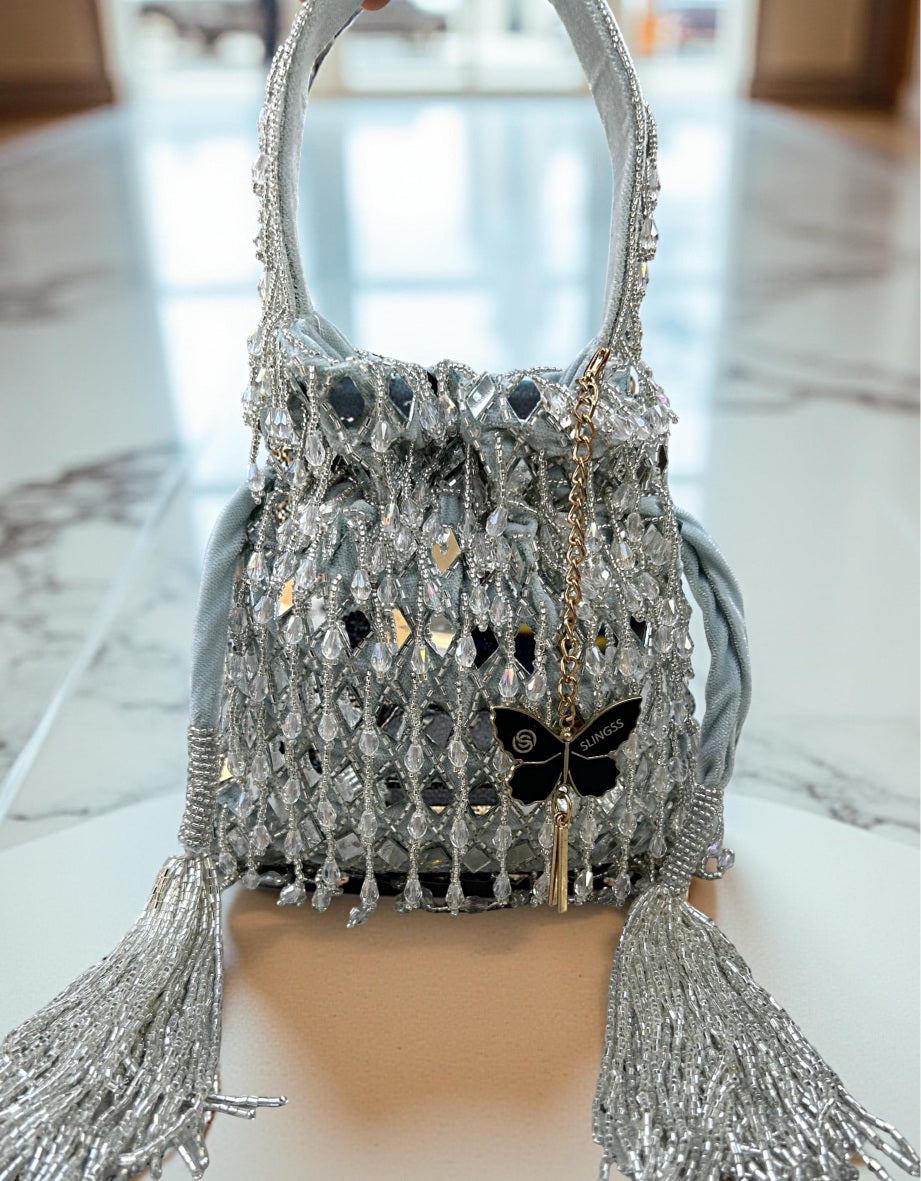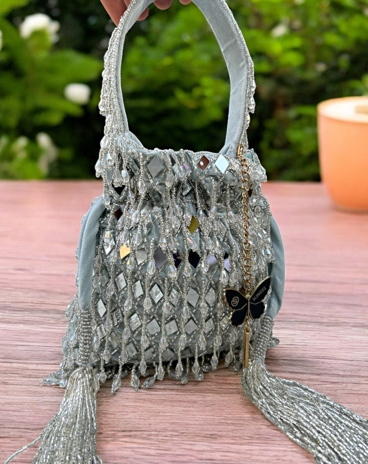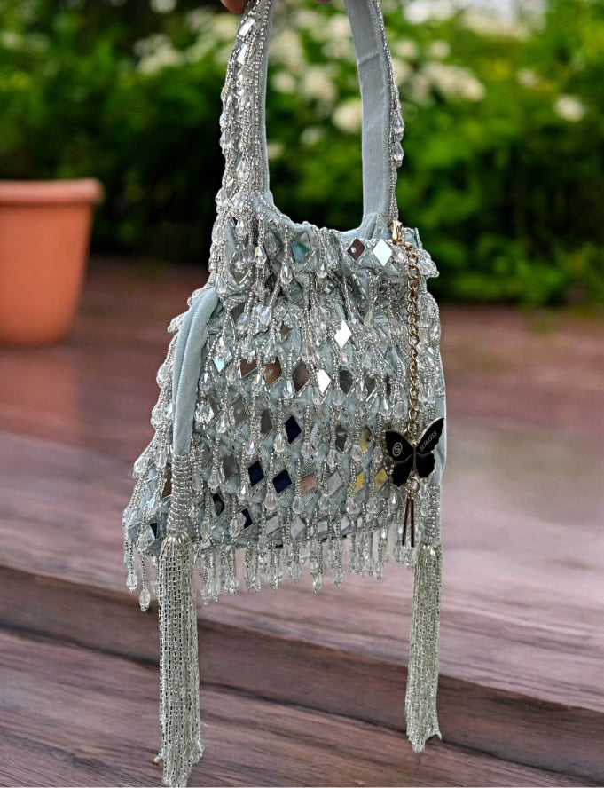Slingss Exclusive Luxury Range Mirror Embroidered Jhallar Partywear Potli For Ladies With Handle