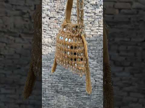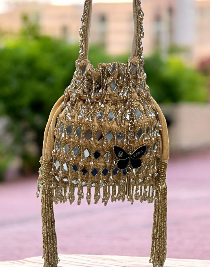 Slingss Exclusive Luxury Range Mirror Embroidered Jhallar Partywear Potli For Ladies With Handle