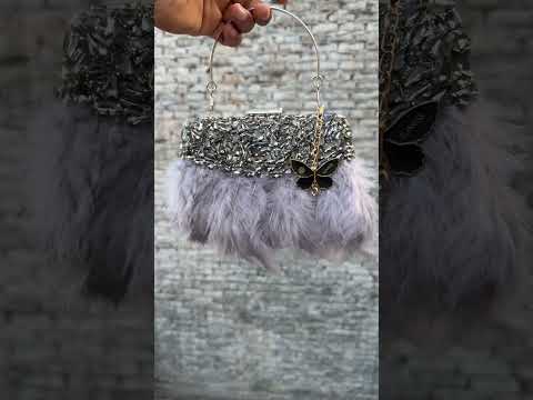 Slingss Exclusive Luxury Range Partywear Feather Diamond Embroidered Clutch For Ladies With Handle & Long Chain