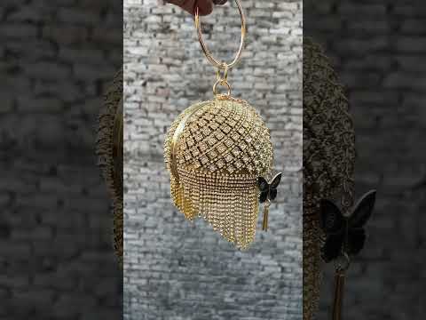 Slingss Exclusive Premium Ball Shaped Partywear Embroidered Clutch For Ladies With Gold Handle & Long Chain