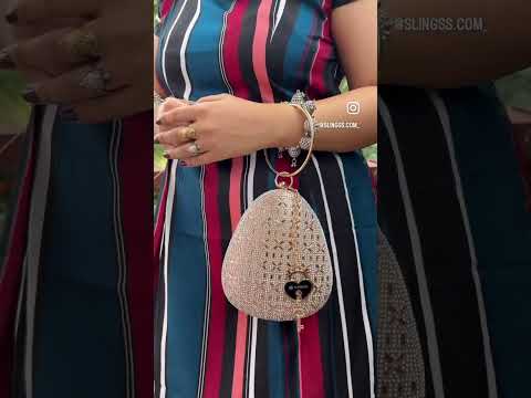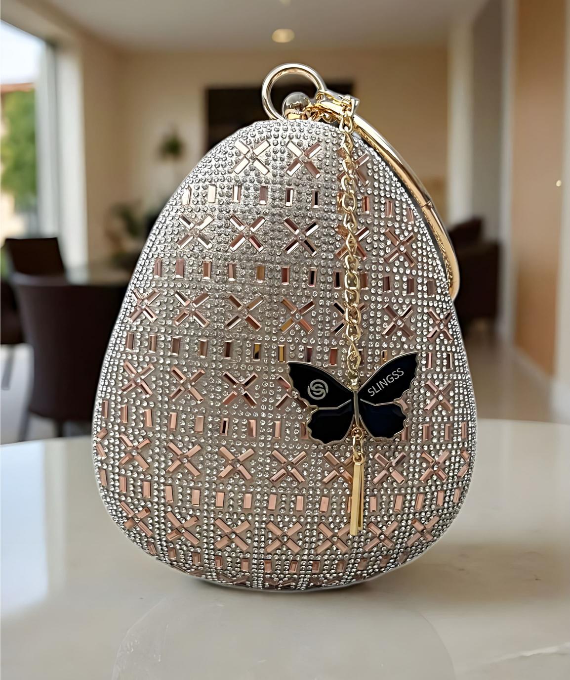 Slingss Exclusive Premium Oval Shape Partywear Embroidered Clutch For Ladies With Golden Handle & Chain