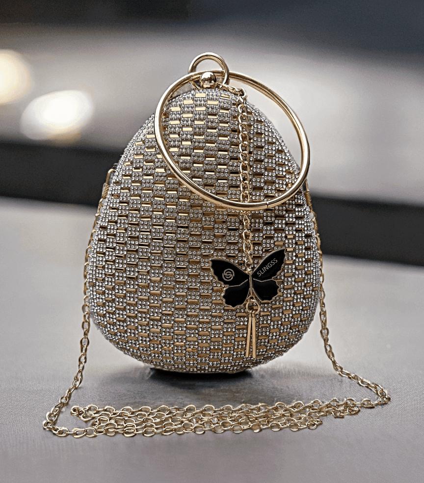 Slingss Exclusive Premium Oval Shape Partywear Embroidered Clutch For Ladies With Golden Handle & Chain