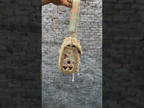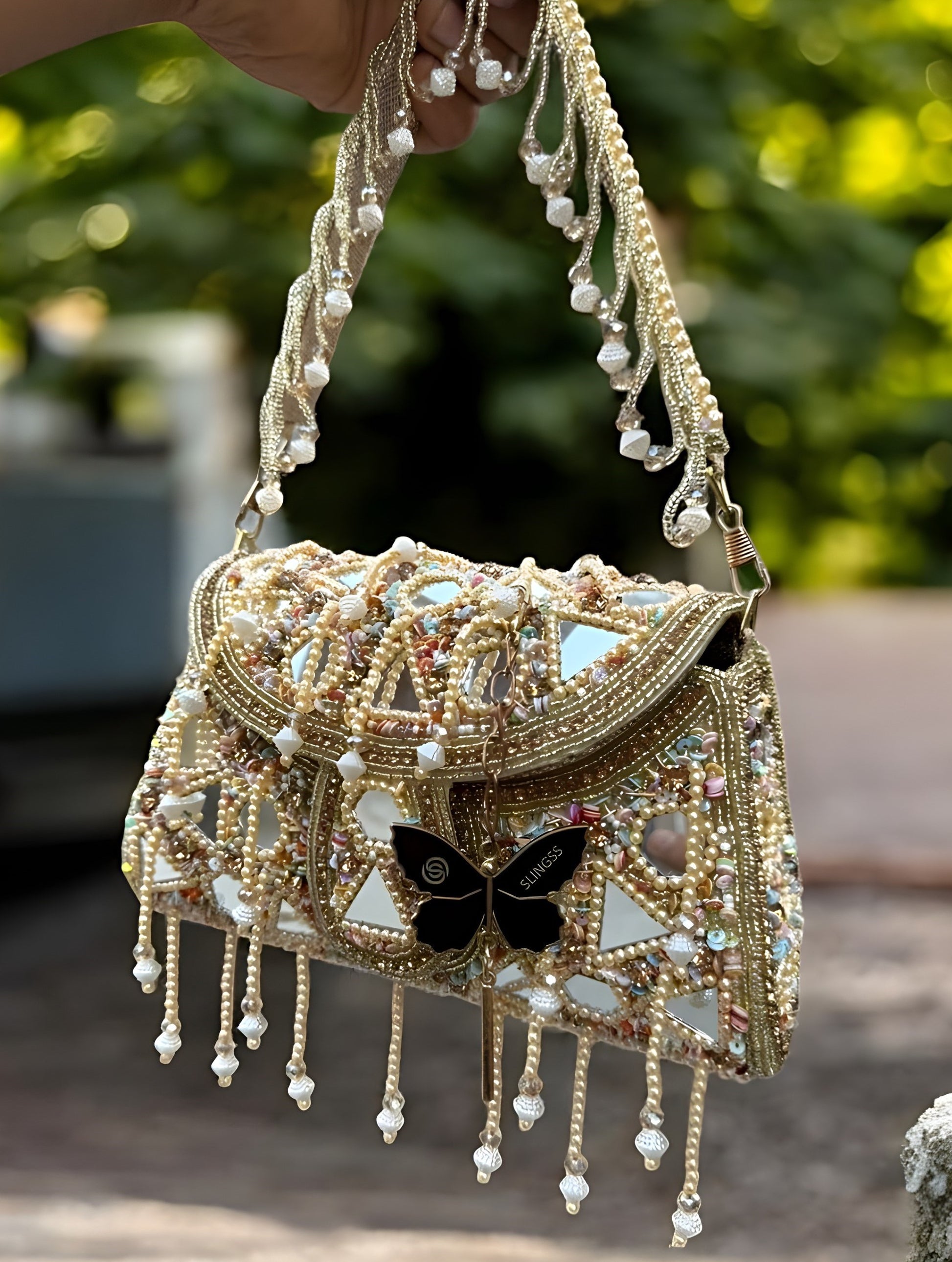 Slingss Luxury Range Hanging Beads Mirror Embroidered Partywear Handbag For Ladies With Handle