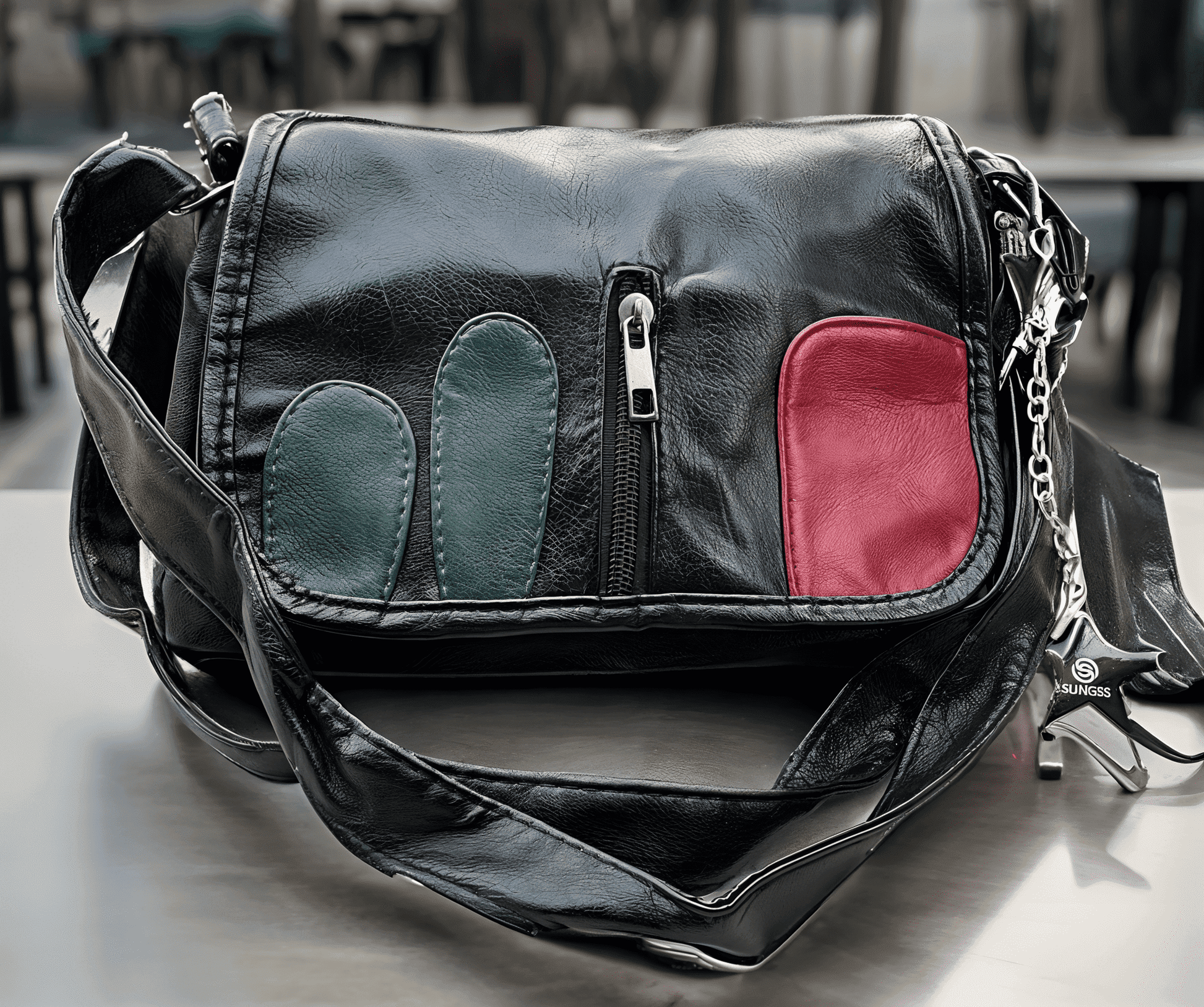Slingss Premium Leather Black With Red & Green Patch Sling Bag For Ladies With Long Belt